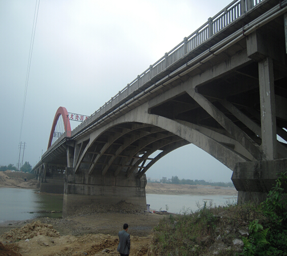 春州大橋于1994年設計,1995年開工,2002年建成通車。該橋全長484.50m,跨徑組合為:6×16mT梁)+4×45m(剛架拱)+80m(中承拱)+45m(剛架拱)+3×16mT梁),橋面凈寬(m):1.5+15+1.5。下部結構:梁橋部分采用三柱墩,鋼筋混凝土鉆孔灌注樁基礎,雙排樁薄壁橋臺;拱橋部分用混凝土實體墩身,除11號墩為擴大基礎外,拱橋均用雙排鋼筋混凝土鉆孔灌注樁基礎。春州大橋設計荷載為汽-20,-10