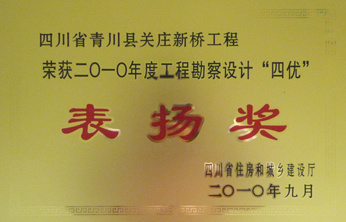 榮獲四川省住房和城鄉(xiāng)建設廳頒發(fā)的“四川省青川縣關莊新橋工程項目” 2010年度工程勘察設計“四優(yōu)”表揚獎